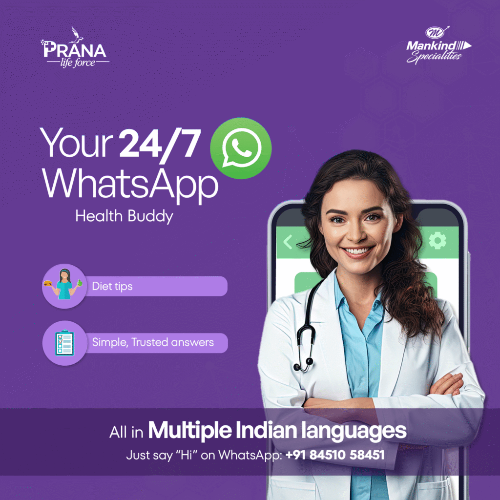 Prana is an AI-powered WhatsApp-based health assistant by Mankind Specialties that helps patients and caregivers access reliable, easy-to-understand information about chronic conditions like diabetes, heart disease, cancer, and more. Prana offers instant support in multiple Indian languages and even understands voice notes, making it easier than ever to get trusted health guidance. Just say “Hi” on WhatsApp to +91 8451058451 and simplify your health journey—anytime, anywhere.